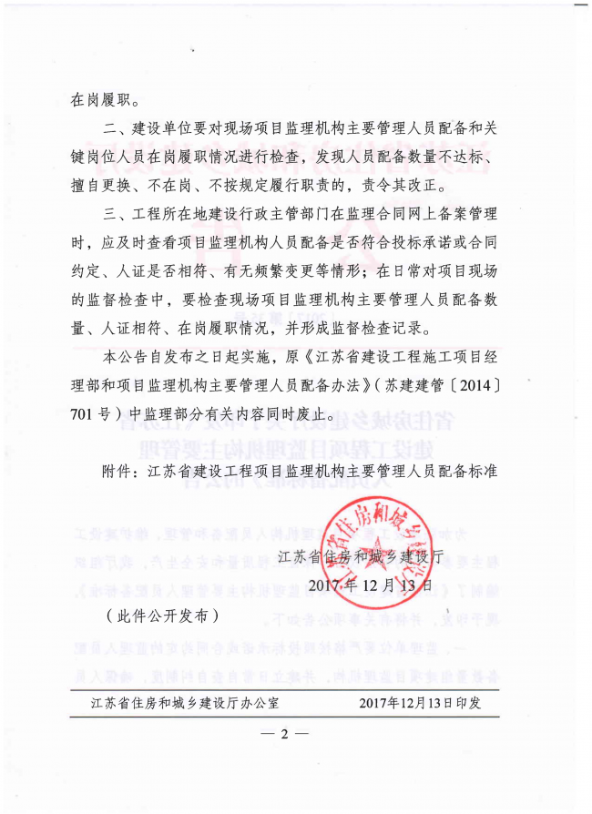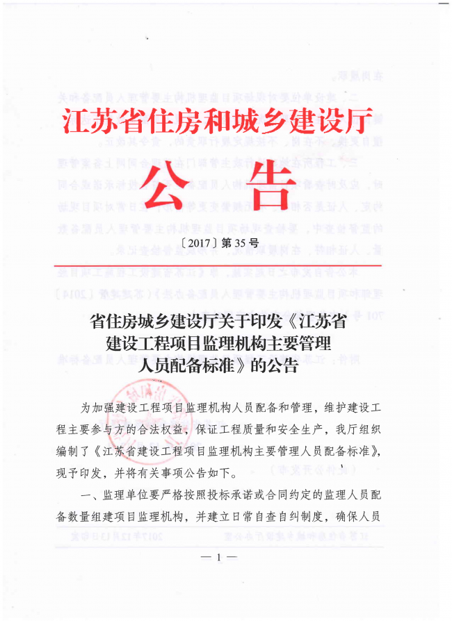 省住房城鄉建設廳關于印發《江蘇省建設工程項目監理機構主要管理人員配備標準》的公告(〔2017〕第35號)